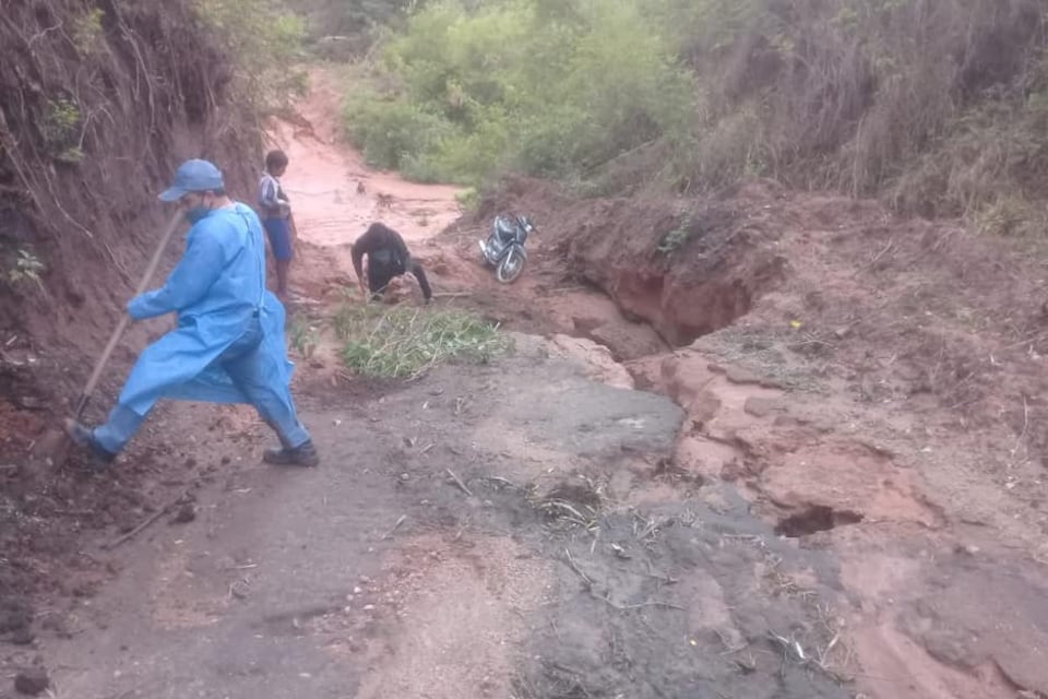 Pese a las protestas, el intendente Rubén Méndez no envió a arreglar el acceso, personal sanitario de la salita reparó una parte a pico y pala para cruzar en motos. La ambulancia no puede ingresar.