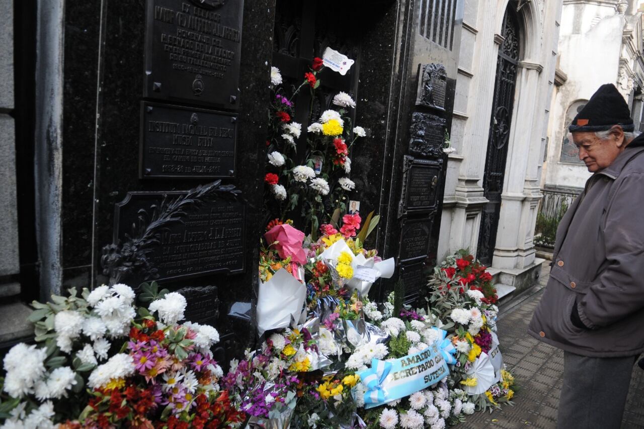 En esa construcción en forma de laberinto con 7000 mausoleos, el suyo es visitado todo el año. “A correrse para acá así todos pueden pasar”, indica el encargado de mantener la circulación por el angosto pasillo. “Se pueden sacar fotos, pero no se puede hace sonar el bombo, ni sacar pancartas, ni encender velas”.