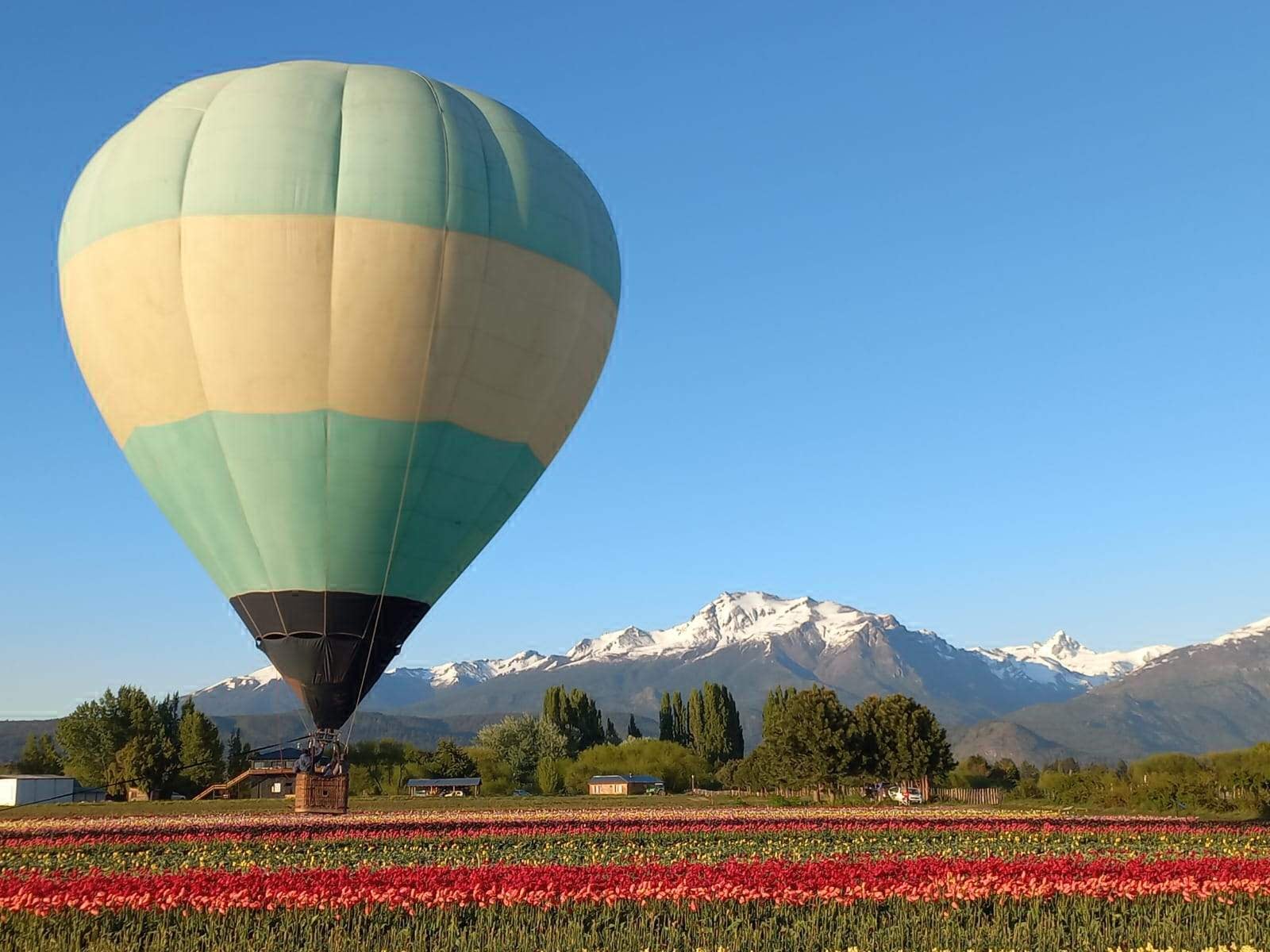Florecieron los tulipanes en Trevelin y un globo aterrizó en ellos