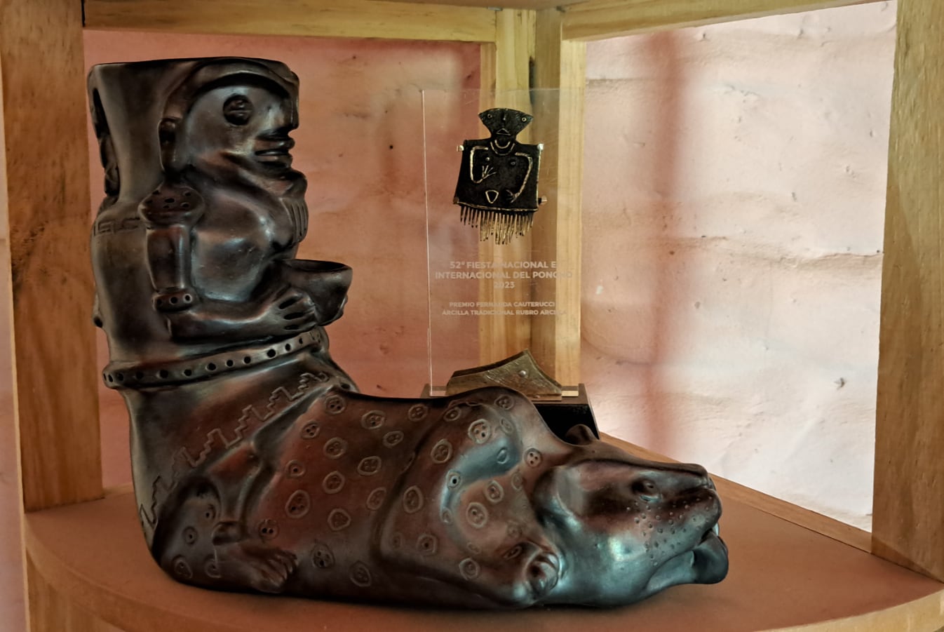 La metamorfosis de un hombre médico que se convierte en uturuncu expresada en una obra de exquisita textura y color realizada con técnicas de alfarería originaria, basada en la creencia ancestral de los diaguitas, le dio el primer premio en la edición 2023 de la Fiesta Nacional e Internacional del Poncho de Catamarca.