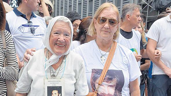 La foto de Gustavo Cortiñas está prolijamente protegida pero denota el paso del tiempo. La de Santiago Maldonado en la remera de su mamá es más reciente.
