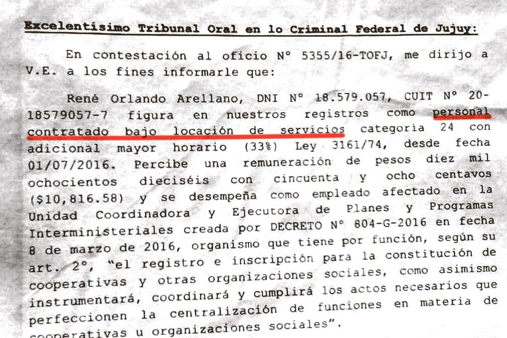 Página 12 accedió al documento que prueba las mentiras de René "Cochinillo" Arellano, el único testigo contra Milagro Sala, que ocultó que era empleado del gobernador Gerardo Morales. Demolido su testimonio, aumenta el costo que enfrentará el tribunal si finalmente condena a la dirigente social.
