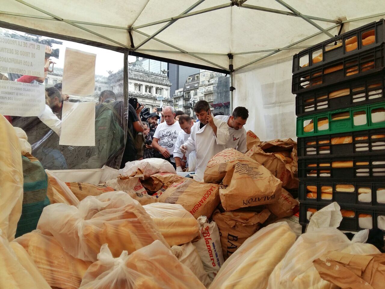 Los panaderos de Buenos Aires convocaron a una protesta frente al Congreso donde regalarán cinco mil kilos de pan. Fila desde temprano para conseguir pan gratis.