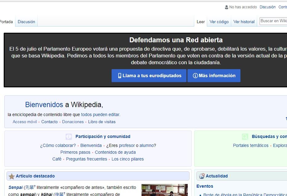La plataforma de información libre y colaborativa, Wikipedia, se apagará durante 36 horas en rechazo a una normativa que prevé aprobar la Unión Europea para regular los derechos de autor o Copyrigh