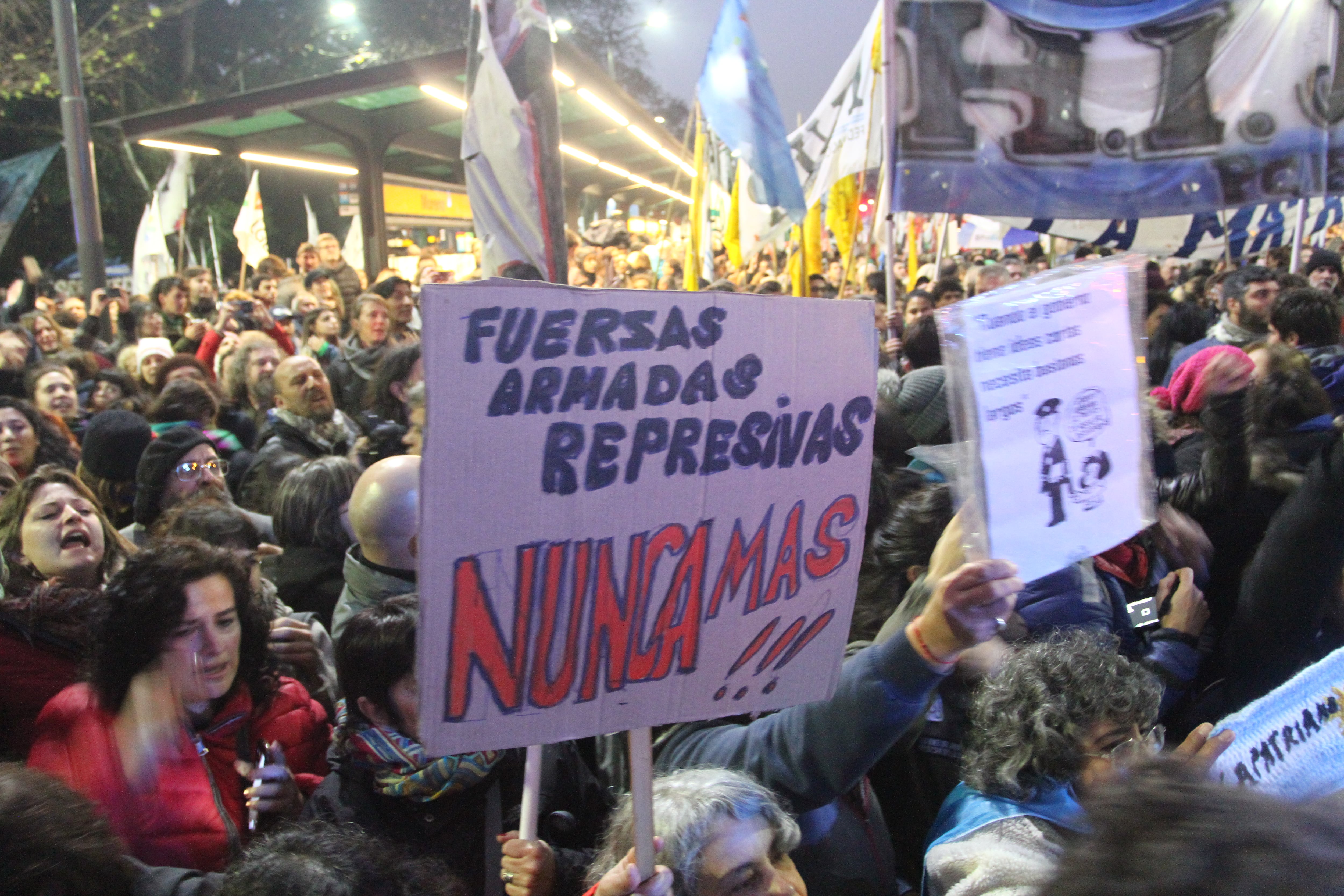 Miles de personas participaron frente al Ministerio Defensa de la manifestación contra la decisión de Mauricio Macri de sacar los militares a la calle. Los organismos de derechos humanos, que convocaron a movilizarse junto con organizaciones sociales y políticas, advirtieron que se refuerza "el modelo represivo de un Gobierno, que representa los intereses de pocos, mientras empobrece a las mayoría".