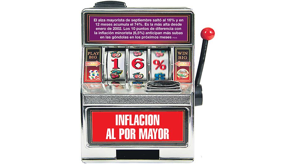 El alza mayorista de septiembre saltó al 16% y en 12 meses acumula el 74%. Es la más alta desde enero de 2002. Los 10 puntos de diferencia con la inflación minorista (6,5%) anticipan más subas en las góndolas en los próximos meses