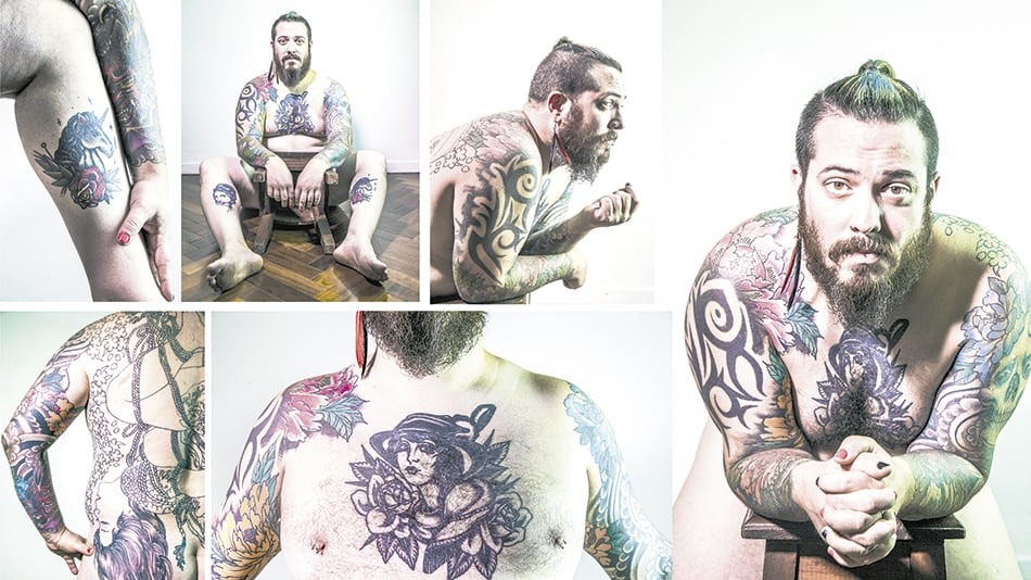 “Mi primer tatuaje fue a los 19 años. Hasta ese momento yo era un lienzo en blanco. Después pasé 12 años sin tatuarme, hasta el momento en el que me empecé a reconocer como bisexual. Hubo una gran reconstrucción de quien yo había sido hasta ese momento. Los tatuajes y los piercings fueron una manera de recuperar mi cuerpo.”