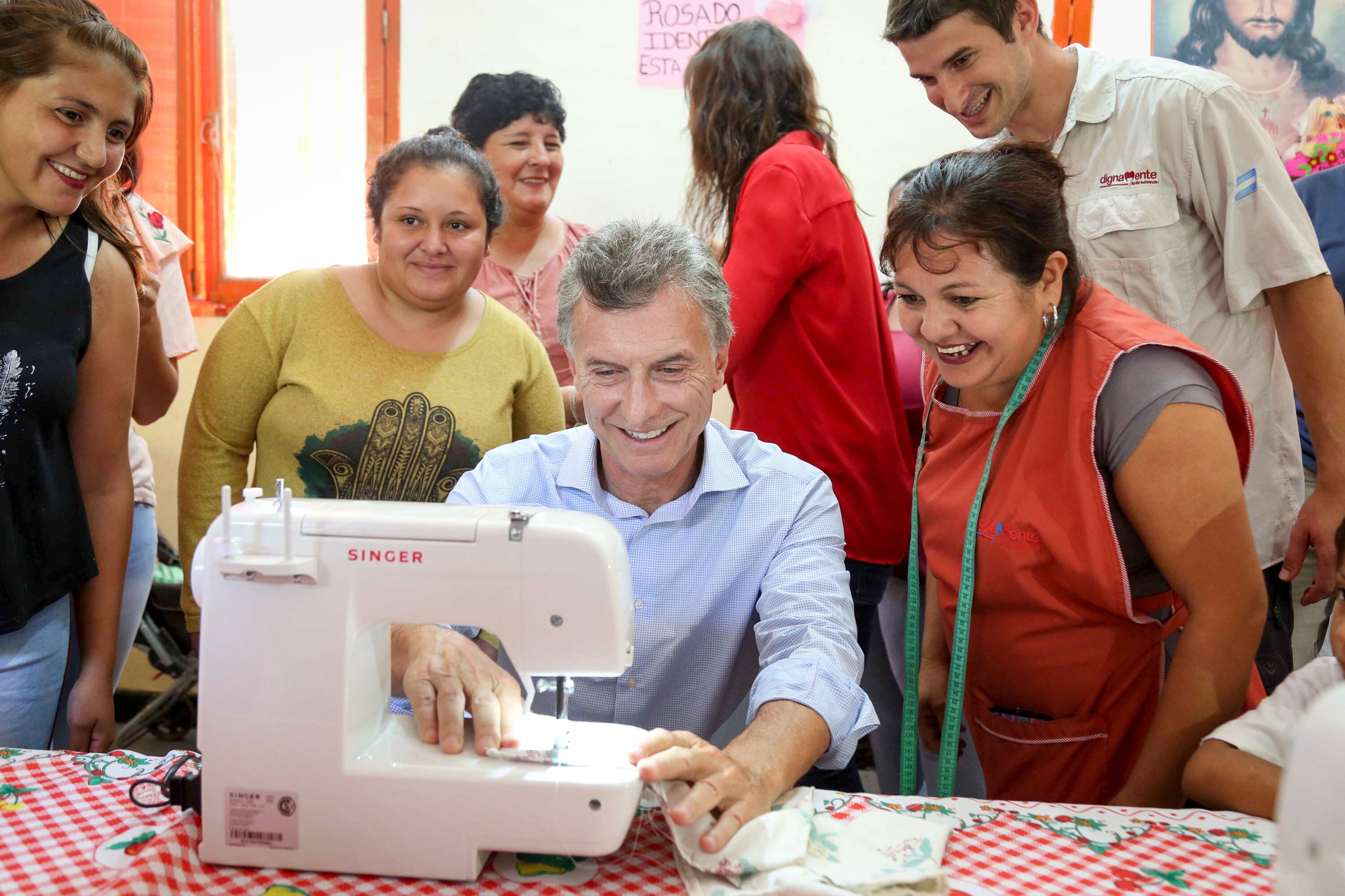 Macri sonriente frente a una Singer
