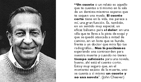 ![]() por Rodrigo Fresán UNA FRASE El hombre y la mujer -explicó el doctor- son entidades químicas fácilmente analizables, fácilmente alterables por el incremento artificial o la eliminación de estructuras de cromosomas; mucho más predecibles, mucho más maleables que la vida de algunas plantas y, en muchos casos, mucho menos interesantes (John Cheever, El escándalo Wapshot). OTRA FRASE El hombre no es un ser sencillo. La espectral compañía del amor siempre con nosotros (John Cheever, Crónica de los Wapshot). JOHN CHEEVER COMO ENTIDAD QUIMICA FACILMENTE ANALIZABLE Cheever, John (1912-1982) Escritor norteamericano de cuentos y novelas nacido en Quincy, Massachusetts. Buena parte de su ficción gira alrededor, humorística y compasivamente, de la empobrecida vida -tanto en lo emocional como lo espiritual- de comunidades privilegiadas. Su primera novela, Crónica de los Wapshot (1957), ganó el National Book Award. En 1956 recibió la Howells Medal para Ficción de la National Academy of Art and Letters. Cuentos y relatos (1978) ganó el premio Pulitzer y el galardón otorgado por National Book Critics Circle Award. ![]() JOHN CHEEVER NO ES UN SER