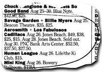 Una curiosidad: el recorte de la revista Time Out Nueva York (la más completa guía de espectáculos de la Gran Manzana) que anuncia un show de Aerosmith con, y he aquí lo que interesa, Los Fabulosos Cadillacs. Pero la suspensión de la gira de los veteranos rockers frenó todas las negociaciones para que el salto de la banda argentina a las ligas mayores, no se concretara. Por otra parte, el manager de la banda, Vaino Rigozzi, confirmó al NO que la banda no realizará más giras en lo que queda del año y que en los primeros meses de 1999 habrá un nuevo disco.