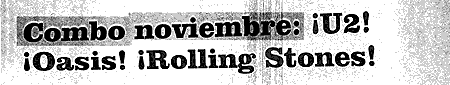 Siempre están editándose discos en Gran Bretaña, es cierto, pero si hubo un día en el que semejante escena se pudo haber repetido más de una vez en Gatwick (como le sucedió a este cronista) o Heathrow fue el domingo pasado, ya que este lunes que pasó llegó una verdadera avalancha de nuevos lanzamientos para todos los gustos. Bah, nuevos es todo un decir. Sobre todo si se trata de un grandes éxitos de la década pasada, un seleccionado de lados B, y un álbum en vivo. Pero, claro, nunca hay que dejar de tener en cuenta que estamos hablando de U2, Oasis y los Rolling Stones. O, mejor dicho, de Oasis y U2. Porque del nuevo disco de los Stones nadie habla en Londres. Hay, sí, algún poster en las disquerías. Y apenas un par de líneas en Q, la revista de rock inglesa más correcta y educada. Que, sin embargo, elige titular su crítica de No Security como Easy Money. Dinero fácil, o sea.