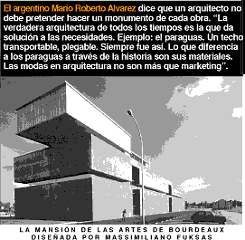 Mario Roberto Alvarez Aprendí que un arquitecto no debe pretender hacer un monumento de cada obra. La verdadera arquitectura de todos los tiempos es la que da solución a las necesidades. Ejemplo: el paraguas. Un techo transportable, plegable. Siempre fue así. Lo que diferencia a los paraguas a través de la historia son sus materiales. Las modas en arquitectura no son más que marketing.