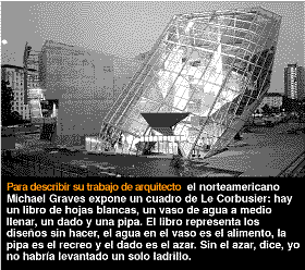 Formas Michael Graves es un posmodernista de Nueva Jersey. Por sus fotos pasan colores llamativos, escaleras doradas, cerámicas orientales, caricaturas de capiteles corintios gigantescos, como divertidos ensambles de rompecabezas infantiles. Toda su arquitectura tiene un aire festivo que la acerca a los shoppings más felices. Para relatar su trabajo de arquitecto, expone un cuadro de Le Corbusier: hay un libro de hojas blancas, un vaso de agua a medio llenar, un dado y una pipa. El libro representa los diseños sin hacer, el agua en el vaso es el alimento, la pipa es el recreo y el dado es el azar. Sin el azar, dice, yo no habría levantado un solo ladrillo.
