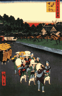 Las estampas exhibidas en estos días en Buenos Aires forman parte de las series Cien famosas vistas de Edo y Famosas vistas de las sesenta provincias, producidas entre los años 1853 y 1858. Se trata de bellísimas colecciones que en el contexto de la producción de Hiroshige gozan de una consideración menor que las realizadas durante el período 1830.1844, porque son de menor calidad relativa, producidas cuando el artista, ya muy popular, trabajaba al ritmo que le imponían la avidez de sus editores y sus propias necesidades económicas. Antes de eso, en 1832, Hiroshige hizo un viaje entre Edo y Kioto a lo largo del camino de Tokaido. Se detuvo en cincuenta y tres oportunidades a pasar la noche y en cada estación tomó apuntes e hizo dibujos de cada detalle. Ese mismo año publicó Cincuenta y tres estaciones del Tokaido, una serie cuyo éxito lo convirtió en el artista más popular de ukiyo-e y lo llevó a comenzar varias series de famosas vistas del Japón.