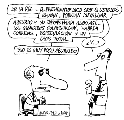 Después de la deuda externa, la paridad cambiaria ocupa el centro de la campaña: Menem aseguró en Brasil que teme que, si gana la Alianza, vuelvan las devaluaciones. De la Rúa le contestó que ningún argentino, ni ebrio ni dormido, y menos el Presidente, puede hacer esas afirmaciones