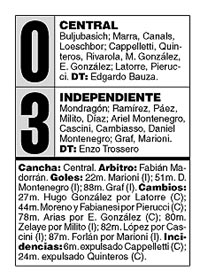 Independiente se aferró a la punta al menos hasta que River complete su partido suspendido ante Racing. El equipo de Enzo Trossero goleó 3-0 a Central en Arroyito y se sacó de encima a uno de los rivales más difíciles que le quedaban hasta el final del campeonato. Bruno Marioni, Daniel Montenegro y Claudio Graf convirtieron los goles de Independiente, ante un Central que jugó tres cuartos de partido con nueve jugadores por las expulsiones de Cappelletti y Quinteros.