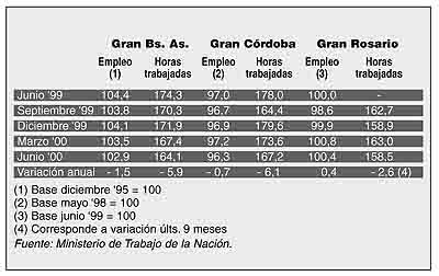 La caída del empleo privado en el Gran Córdoba, siempre según la encuesta oficial, comenzó a manifestarse a partir de abril. Acompañando el deterioro de la ocupación, las horas mensuales trabajadas se ubicaron en un rango de 160 a 167, contra 170 a 180 horas que se trabajaban entre noviembre y marzo últimos. En esta provincia, se destaca la caída del empleo en comercio, restaurantes y hoteles (4 por ciento), mientras que crece en la industria manufacturera (1,9) y construcción (1,6).