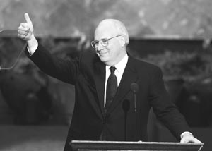 Cheney hizo el fuerte discurso que toda la semana les había sido negado a los 2066 delegados, energizando a los fieles con una serie de ataques dirigidos a Clinton y a su contrincante presidencial demócrata, el vicepresidente Al Gore. “Estamos todos un poco cansados de la rutina Clinton-Gore. Pero la rueda ha girado. Y esta vez, les toca a ellos irse”, le dijo Cheney a la convención, plagiando una frase que Gore había usado contra los republicanos en 1992, cuando el partido conservador se encontraba en el poder. Dos veces más durante su discurso repitió el mantra “les toca a ellos irse”, provocando que los delegados se pusieran de pie en despliegues de entusiasmo.