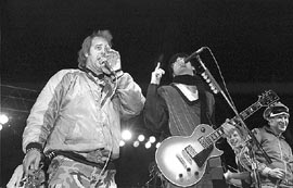 Los Calzones, locales en Bariloche (donde viven seis meses al año y tocan unas nueve veces por semana), salieron con un repertorio de grandes éxitos y mensajes “para los milicos de mierda”, en una ciudad donde la tradición castrense es casi tan fuerte como la del chocolate. El monumento a Roca y la campaña genocida que le da nombre a la plaza del Centro Cívico (Expedicionarios al Desierto) completaban el choque ideológico-estético. Después de su show, volvió el animador con más consignas danzarinas. “¿Qué pasa a las tres de la mañana en Rocket (una de las discotecas)?”, desafió a los presentes. “¡Se baila el hooky–hooky!”, reveló, y luego ensayó un paso de aerobic. Reaparecieron los gritos de “tomatelá”, la nevizca y la ansiedad. Estaba oscuro, nublado y Los Auténticos Decadentes se abrigaban para la invasión escénica multicolor. Doce profesionales de la diversión en el puerto nevado de la adolescencia permanente. Y ellos sólo hicieron su trabajo. Todos los hits todos: “Cómo me voy a olvidar”, “Corazón”, el nuevo “No puedo”, “La guitarra”, “(Loco) tu forma de ser”, “El murguero”, “El Gran Señor”, “Raquel”, “Gente que no”...