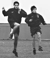 En la práctica de fútbol de la mañana, Riquelme logró dos de los cuatro goles que los titulares convirtieron a los suplentes. El primero con un remate de media distancia y el segundo con un cabezazo, en tanto que Barijho y Gustavo Barros Schelotto convirtieron los restantes. Por más que el entrenador Carlos Bianchi no lo confirmó, el equipo que practicó ayer sería el titular, con Córdoba; Ibarra, Bermúdez, Matellán, Fagiani; Marchant, Battaglia, Gustavo Barros Schelotto, Riquelme; Barijho, Palermo.
