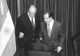 Los senadores le dispensaron un trato amable al ministro. Los legisladores querían saber la razón que tenía Hacienda para declarar la emergencia económica y, de paso, reclamarle a Machinea sobre la angustiosa situación por la que atraviesan los distritos del interior. Con respuestas cortas y precisas, el ministro fue respondiendo cada uno de los requerimientos. En su intervención, dejó en claro su fuerte oposición a la propuesta de los senadores para que la Nación lance un bono por 5000 millones de dólares para aliviar el peso de las deudas provinciales. “Si ustedes hacen eso, aumentaría un 52 por ciento el total de colocaciones de títulos públicos que hace la Nación cada año. Sería atentar contra el crédito del país”, acusó.
