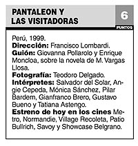 Es la segunda vez que Francisco Lombardi, sin duda uno de los realizadores latinoamericanos de más seguro oficio, adapta a Vargas Llosa. El realizador, que cuenta con una decena de films en su haber (la magnífica La boca del lobo, de 1988, sigue siendo, por lejos, la mejor), había filmado ya, a mediados de los 80, La ciudad y los perros. Aquí, y hasta aquel traspié del final, Lombardi hace funcionar un relato que, se diría, basta con transcribir literalmente para que camine. Se diría, si no fuera porque el propio “Varguitas” demostró, allá por 1975, que no era tan fácil, cuando cometió el error de dirigir su propia versión cinematográfica. Allí, Pantaleón había sido José Sacristán, y una semiderruida Katy Jurado, la inquietante prostituta que debería enloquecerlo. Ahora, las cosas están más en su lugar.
