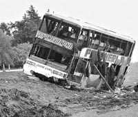 El ómnibus se salió del asfalto, primero dio contra un puentecito y después contra un árbol, un paraíso que arrancó de cuajo; dio varios tumbos y volcó, relató a una radio cordobesa un conductor que pudo observar el accidente, bajo la lluvia torrencial. El interno 19 de la empresa Expreso Panamericano había salido a las 22 del sábado de la terminal de Retiro, en Buenos Aires, conducido por Juan Quinteros. Con 44 pasajeros, se dirigía a la ciudad de Córdoba, desde donde debía seguir hacia Salta. El accidente se produjo en el kilómetro 511 de la Ruta 9, entre las localidades de Morrison y Bell Ville, a 200 kilómetros de la capital provincial. Los fallecidos son Carla Díaz, de 27 años, domiciliada en Buenos Aires; Cristian Balverdi, de 10 meses, hijo de la anterior; Nelly Beatriz Roble, de 66, que vivía en Tucumán; Rosa Lidia Lizarraga, Alberto Caro, una mujer todavía no identificada y un hombre llamado Dionisio que murió poco después del accidente, en el hospital de Bell Ville. Allí están internados los heridos, que suman veinte. Las causas del accidente todavía se desconocen. Fuentes policiales de Bell Ville tenían como principal hipótesis un posible un error del chofer, sumado a las condiciones climáticas adversas. Llovía torrencialmente cuando tuvo lugar el accidente. Los bomberos y los peritos policiales trabajaron durante toda la mañana de ayer y, con la ruta cortada, se formó una fila de vehículos de más de un kilómetro y medio en la mano que va hacia Córdoba. Para aligerar el embotellamiento, la policía estableció un desvío para tránsito pesado a dos kilómetros del lugar. Para colmo, a una ambulancia que, desde Bell Ville, iba a socorrer a los heridos en el accidente, le estalló un neumático. Su conductor perdió el control y chocó con un remise que venía en dirección contraria. Quedó gravemente herido el pasajero del remise, Luis Eduardo Franciscón, y también sufrieron heridas el chofer del auto, Pablo Martínez, y el de la ambulancia, Ariel González. El director del hospital de Bell Ville, Eduardo Fantini, denunció que el micro accidentado tenía el seguro vencido. La empresa Trainmet Seguros SA informó que al ómnibus se le había vencido la póliza, dijo el médico, en declaraciones a una radio local. La información fue desmentida por el gerente de la empresa Expreso Panamericano, Alberto Albarracín, quien aseguró que ésa es una versión malintencionada. Las empresas que no tienen su seguro reglamentario y vigente no pueden circular, razón por la cual esa información es apresurada, afirmó. Según el directivo, el accidente se debió, en principio, a que había una gran tormenta, con mucha lluvia y poca visibilidad. Alberto Silveira, titular de la organización no gubernamental Luchemos por la Vida, observó para este diario que el accidente de Bell Ville aparenta ser uno más de los que, en la Argentina, se vinculan con la falta de profesionalidad de los choferes profesionales, que aquí causa más del 20 por ciento de los siniestros, mientras que en los países desarrollados estos conductores no provocan más que el 1 o 2 por ciento de los accidentes. Los choferes profesionales suelen cometer aquí todo tipo de impericias; las empresas los cambian constantemente de turno, de maneraque no logran adecuar sus ritmos físicos y psíquicos a los diversos tipos de conducción. Faltan totalmente los controles públicos de velocidad, de alcoholemia, de vigencia de los seguros y de profesionalidad de los choferes, explicó Silveira. Córdoba sufrió otro accidente grave hace exactamente siete días, cuando un micro que llegaba desde Jujuy volcó en un acceso a la ciudad, dejando un saldo de cinco muertos y 16 heridos.
