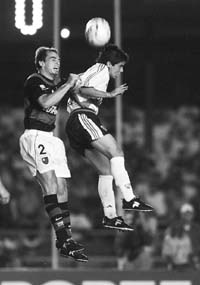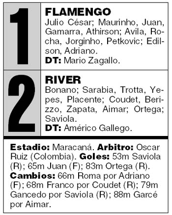 ![]() Al cabo del primer cuarto de hora, era obligatorio chequear dónde se estaba jugando el partido. ¿Era realmente en el Maracaná? Porque el que parecía local era River. Los brasileños jugaban con una parsimonia tal que sugería que estaban convencidos de que, para ellos, era el partido de vuelta. Plantado para jugar de contragolpe, el equipo de Gallego de pronto encontró que resolvía más o menos bien los desafíos que le planteaba el débil ataque rubronegro y empezó a adueñarse de la pelota para manejar los tiempos del partido. En ese ínterin, el equipo argentino concretó dos jugadas de gol. Primero, a los 8, cuando Saviola escapó solo por izquierda aprovechando una réplica. Pero el Conejito la adelantó demasiado, el arquero le cerró el ángulo de remate y el delantero eligió tirar el centro, que despejó el zaguero Juan. Diez minutos más tarde, Coudet se mandó por derecha y lanzó el centro hacia la posición de Ortega, que obstaculizado por su marcador, cabeceó por arriba del travesaño cuando estaba en clara posición de gol. Claro que después de esos pasajes, el Flamengo recordó su condición e intentó ejercer el protagonismo que le correspondía. Con Petkovic como eje de la creación, intentaban acercarse a Bonano, pero no adquirieron la profundidad necesaria, aunque un cabezazo de Athirson se fue cerca de un palo de Bonano. El período terminó decepcionando, entre la medianía del local y el conformismo del visitante que con menos equilibraba el trámite. Pero en la segunda mitad, si los hinchas del Mengao creían que su equipo reaccionaría, se encontraron con otra sorpresa. Nuevamente era River el que se reservaba la iniciativa, el que se mostraba más despierto, el que estaba más dispuesto a golpear al rival. Al minuto del complemento, Ortega picando por la derecha, remató sobre la marca de Maurinho y Julio César sacó al corner con esfuerzo. Siete minutos más tarde se produjo una jugada magnífica: Ortega la tomó en el medio, descargó con Coudet que se la devolvió de taco; el jujeño habilitó a Aimar y éste, por el medio, habilitó en cortada a Saviola que, entrando por el centro del área, definió con izquierda entre los centrales por debajo del cuerpo del arquero. Una joyita. Anestesiado por la desventaja, el Flamengo tardó en reaccionar, y River estuvo cerca de aumentar con otra corrida de Saviola. Parado definitivamente para ensayar la réplica, el equipo argentino se preparaba para liquidar el partido cuando lo sacudió el empate. Un corner ejecutado desde la izquierda recorrió en arco perfecto el área chica: Bonano dudó en salir a cortar y esa duda fue fatal, porque en el segundo palo, Juan le ganó el salto a Yepes y Coudet y clavó la igualdad. Parecía empate clavado: salió cansado Saviola y entró Gancedo, para dar más movilidad. Pero Zapata huyó por izquierda, llegó hasta la raya, sacó el centro y a la carrera, como venía, Ortega le pegó de derecha al gol.