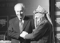 Shimon Peres volvieron a darse la mano en público. Arafat declaró