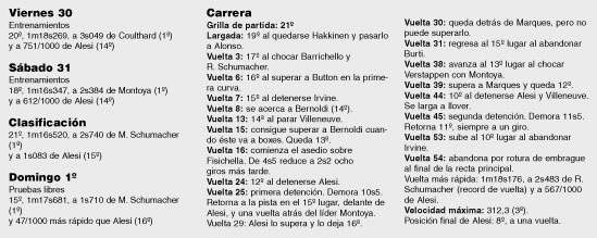 velocidad final (en el sensor oficial, sólo la Ferrari de Schumacher,