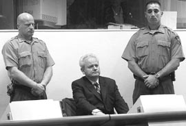 May, y el acusado, el ex presidente yugoslavo Slobodan Milosevic.