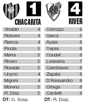 Con el descanso que se tomó Racing, debido a que ya había anticipado su encuentro ante Boca, con derrota incluida, River tenía ayer casi la obligación de sumar tres puntos para empezar a acercarse al puntero. El equipo conducido por Ramón Díaz ya había desaprovechado dos oportunidades de decontarle unidades al equipo de Avellaneda: primero cuando empató ante San Lorenzo y luego cuando perdió con Colón, en Santa Fe. Bajo esa condición se presentó en Caballito para enfrentar a Chacarita, que venía de provocarle serios problemas precisamente a Racing. Pero después de los cuatro goles que le convirtió a Gimnasia, en el estadio de Ferro volvió a exhibir la misma contundencia y también se despachó con otros cuatro tantos.