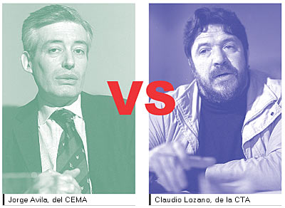 En lo único que se pusieron de acuerdo Jorge Avila y Claudio Lozano es en que el país va camino a la devaluación. El economista del CEMA, centro de estudios acusado por Cavallo de desestabilizar la economía, quiere que el gobierno instrumente la rebaja de sueldos estatales, para asegurar el déficit fiscal cero. El referente económico de CTA, por el contrario, exige que De la Rúa revea su decisión y consiga fondos cobrándole impuestos a los ganadores del modelo. Cash unió en un debate a los representantes de las dos fuerzas que más preocupan al gobierno: los mercados y el movimiento sindical organizado. Avila aseguró que reduciendo los salarios estatales en seis meses se sale de la recesión. Lozano afirmó que esa medida hundiría al país en la depresión económica. El liberal quiere que Argentina ingrese al Nafta; el gremialista dice que es una locura. Cuando se debatió sobre cómo ayudar a los pobres la discusión subió de tono. Lozano exigió un subsidio para los desocupados; Avila insistió en bajar el riesgo país y esperar.