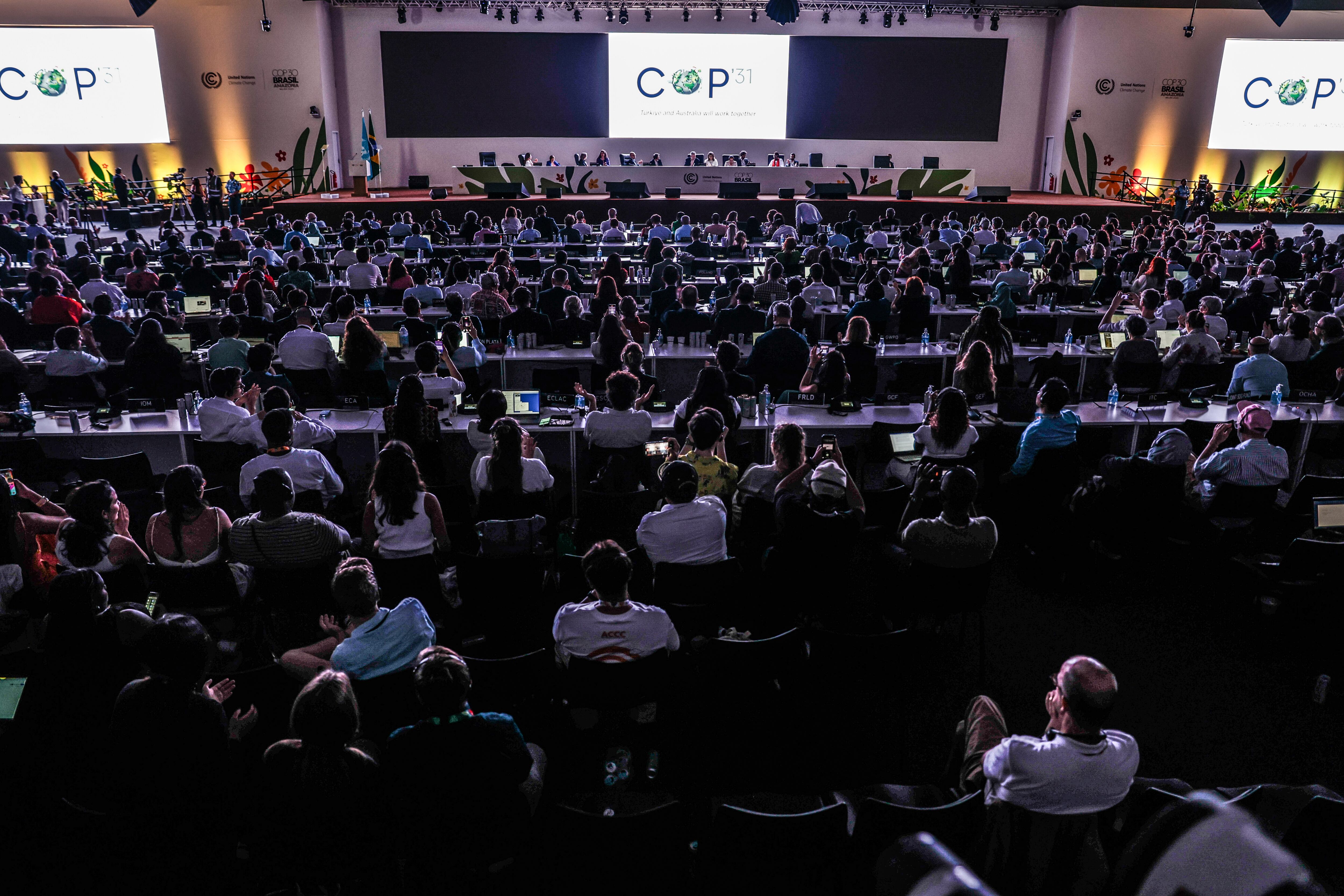 Varios países latinoamericanos objetan la toma de decisiones en la COP30 AME1553. BELÉM (BRASIL), 22/11/2025.- Personas participan en la sesión plenaria de la COP30 en el Centro de Convenciones Hangar este sábado, en Belém (Brasil). Varios países latinoamericanos, entre ellos Argentina, Colombia, Ecuador, Panamá, Uruguay y Paraguay, objetaron la toma de decisiones en la plenaria de clausura de la cumbre climática COP30 y llevaron a la suspensión de la sesión por cerca de una hora. EFE/ Fraga Alves (Fraga Alves, EFE -/EFE)