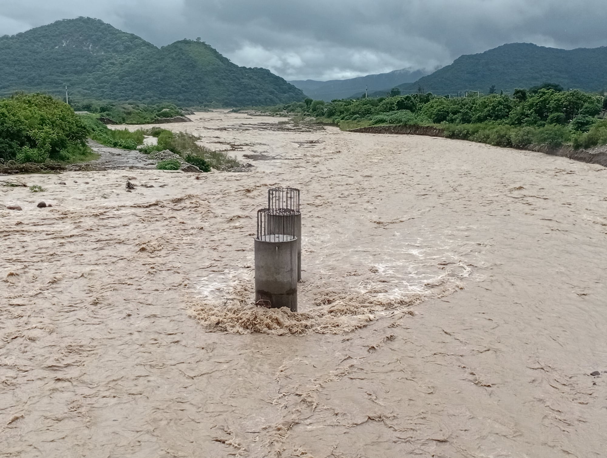 Postal del río Vaqueros ayer al mediodía Pilote del nuevo puente en construcción, resistiendo a la corriente (Analía Brizuela)