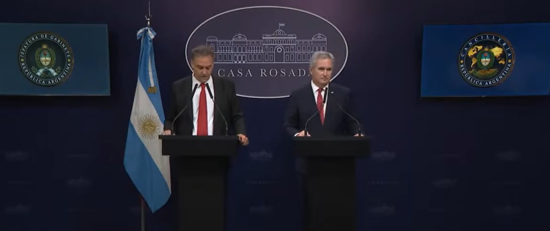 Acuerdo comercial con Estados Unidos Conferencia de prensa del jefe de Gabinete Manuel Adorni y del canciller Pablo Quirno. (Capturas de Video)
