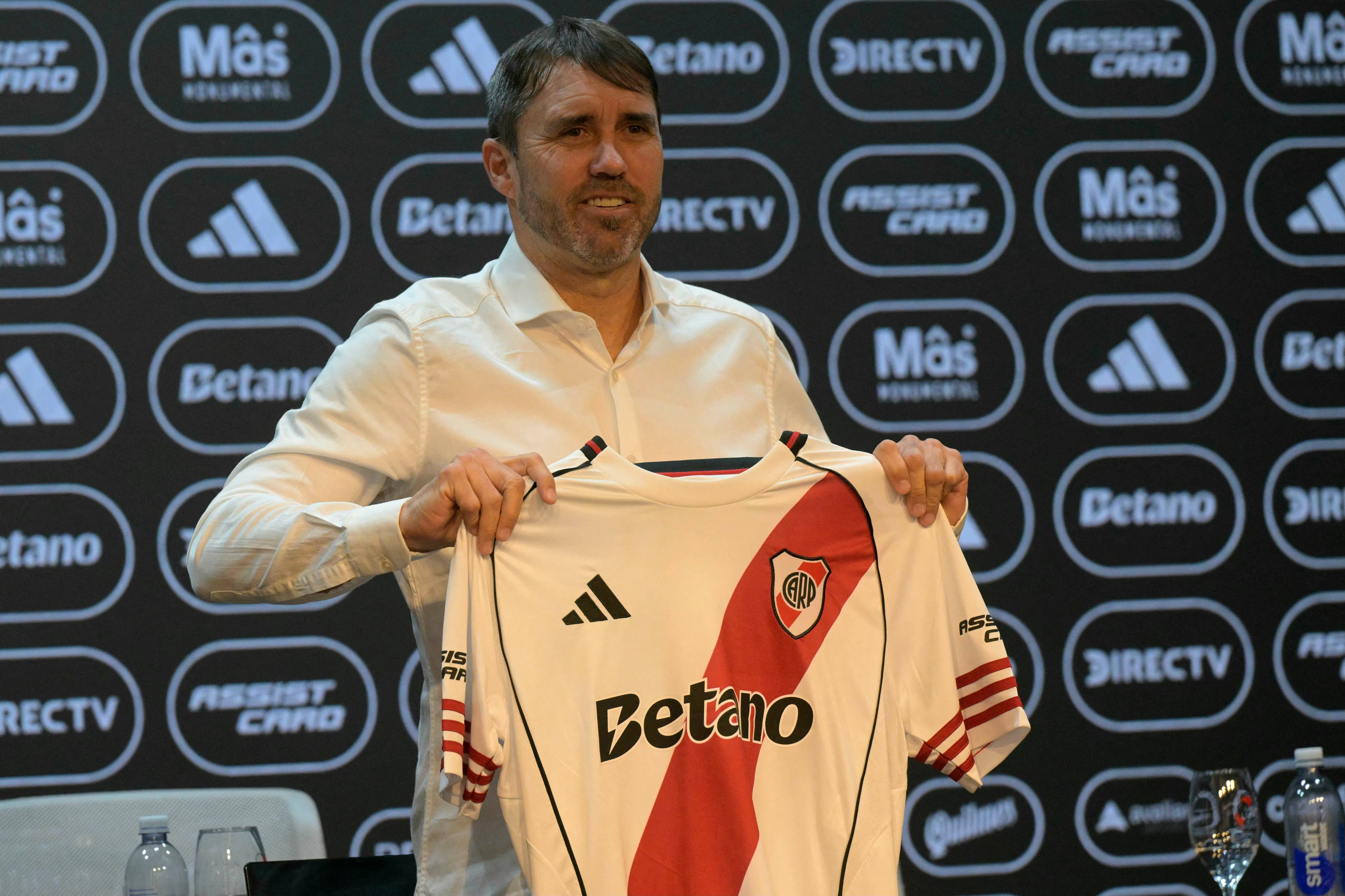Chacho Coudet posa con la camiseta de River durante su presentación como flamante DT. (AFP/AFP)