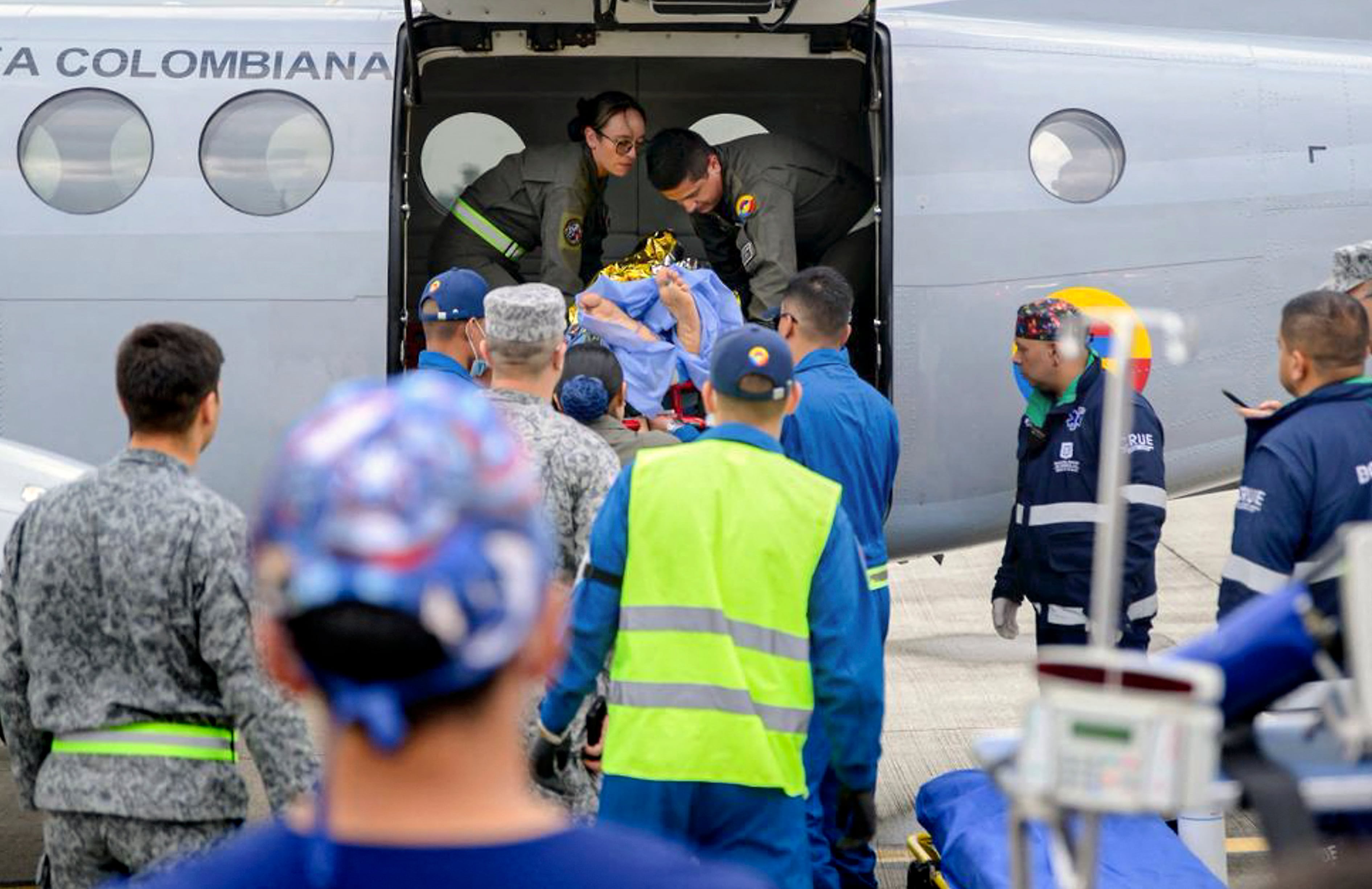 accidente aereo This handout photo released by the Colombian Armed Forces shows members of the Colombian Aerospace Force and paramedics carrying an injured person at CATAM air base in Bogota, Colombia, on March 23, 2026, following the Air Force Hercules aircraft crash earlier today. A Colombian military plane carrying 125 troops and crew crashed during takeoff in Puerto Leguizamo, near the southern border with Ecuador, with as many as 80 people aboard feared dead. (Photo by Handout / Colombian Armed Forces / AFP) / RESTRICTED TO EDITORIAL USE - MANDATORY CREDIT "AFP PHOTO / Colombian Armed Forces " - NO MARKETING NO ADVERTISING CAMPAIGNS - DISTRIBUTED AS A SERVICE TO CLIENTS (HANDOUT/AFP)