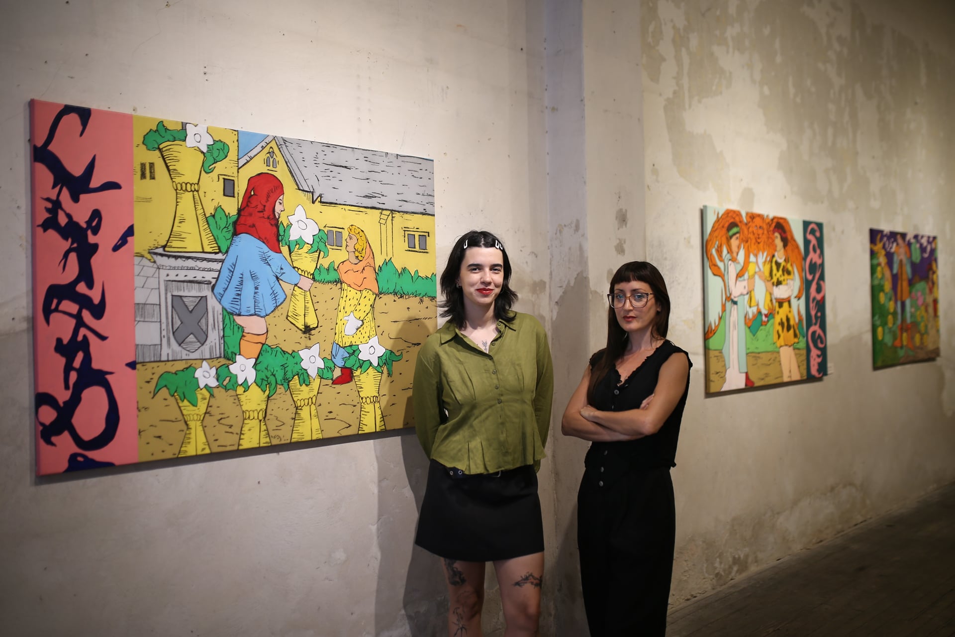 Sistemas de contención, la artista y la curadora posan con una de las pinturas. (JoseNico)