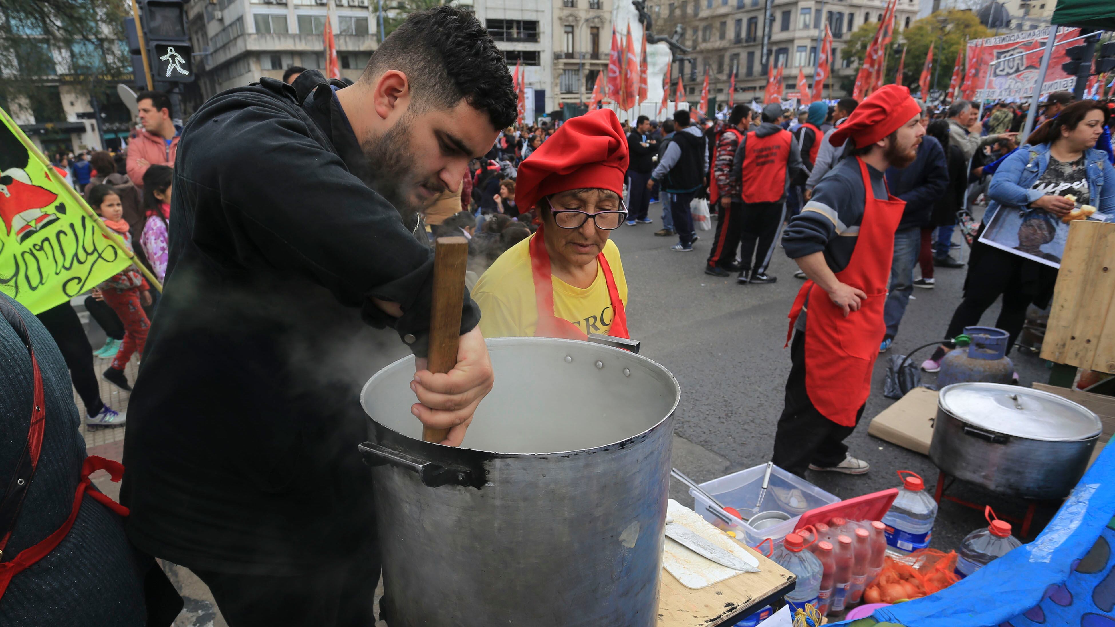 Gremios y movimientos sociales reparten comida y arman una carpa en el Obelisco