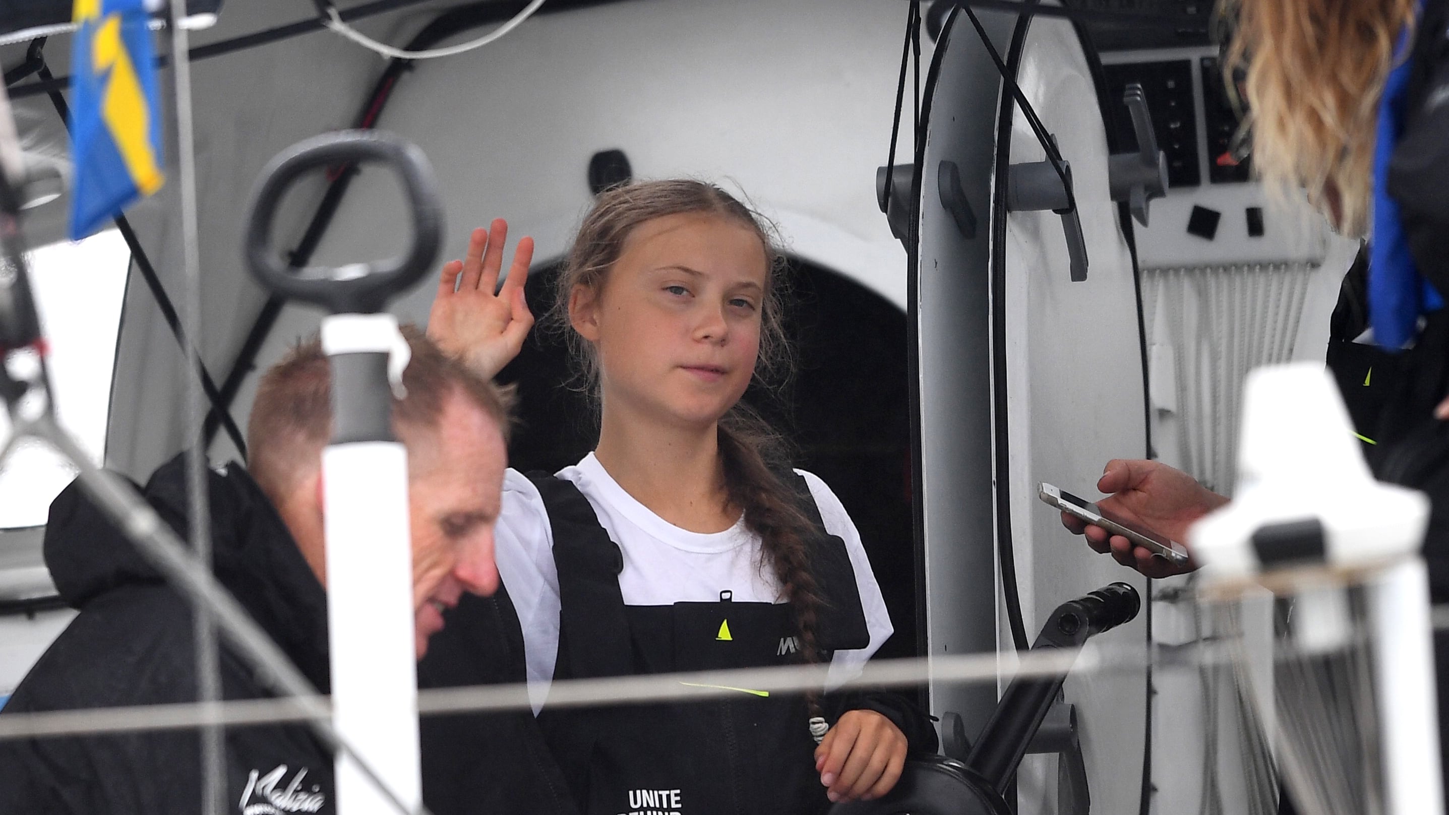 Alrededor de doscientas personas recibieron a la joven ambientalista sueca Greta Thunberg a su llegada a Nueva York, tras una travesía de dos semanas para cruzar el Atlántico en un velero.