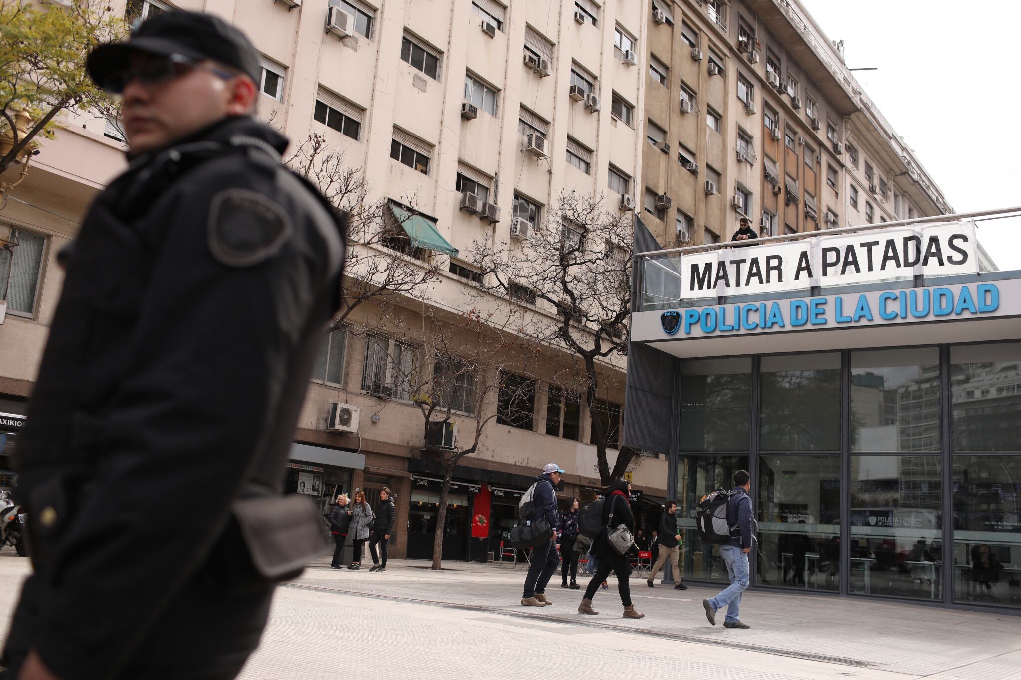A las 15:08, el dramaturgo Juan Pablo Sierra y un grupo de trabajadores de la cultura se pararon frente a la central de monitoreo de la Policía de la Ciudad, ubicado en la peatonal de Sáenz Peña y