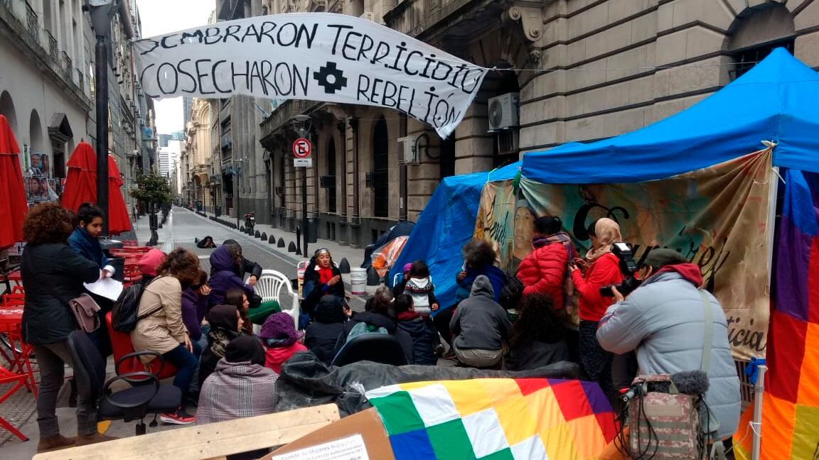 "Sembraron terricidio, cosecharon rebelión", se lee en el pasacalle que colgaron sobre 25 de Mayo al 100 las mujeres indígenas que, a pesar de las inclemencias climáticas, llevan una semana de ocup
