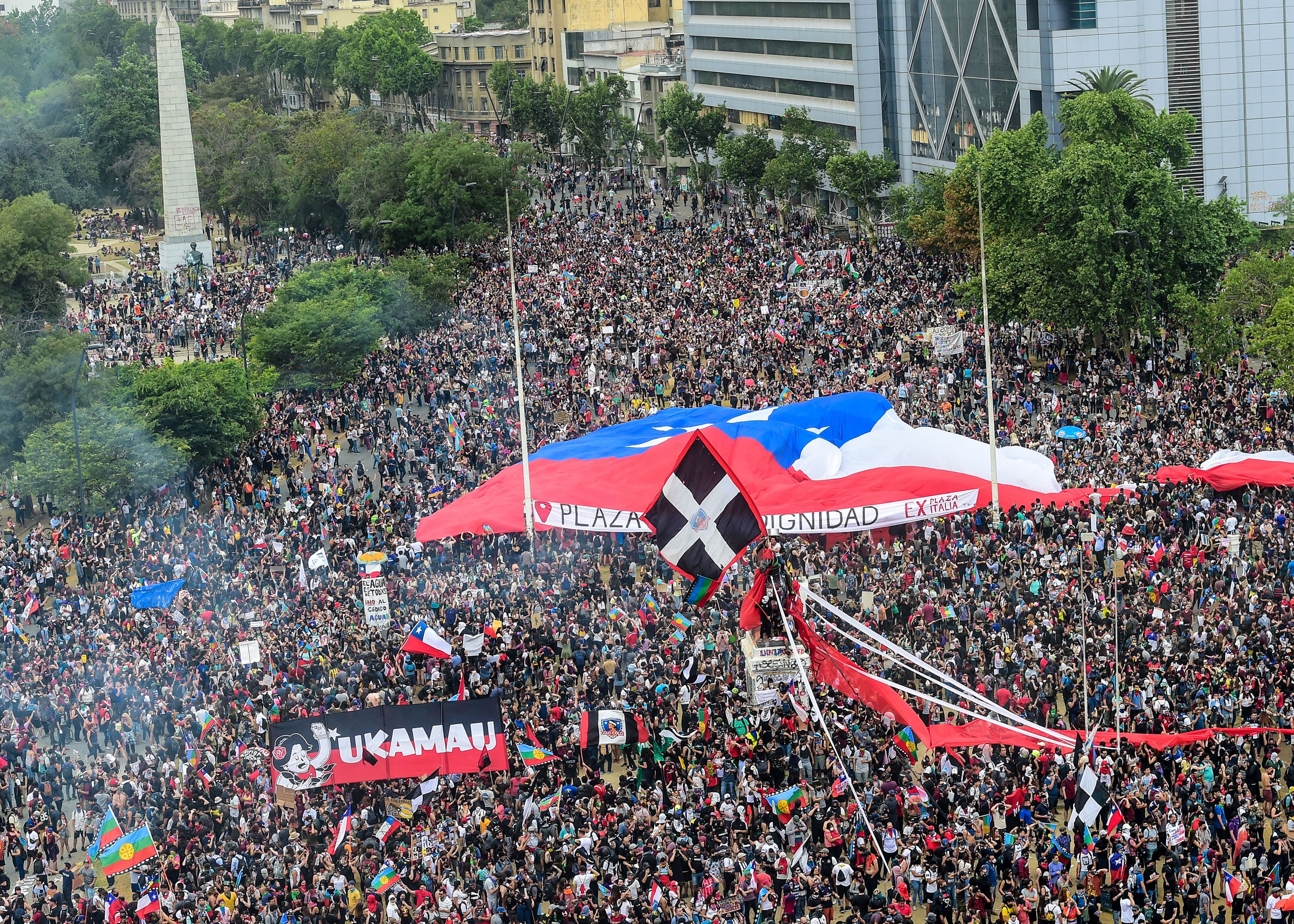 Decenas de miles de manifestantes asistieron a la llamada tercera marcha más grande de Chile, en la céntrica Plaza Italia de Santiago. Ataque e incendio a una universidad.