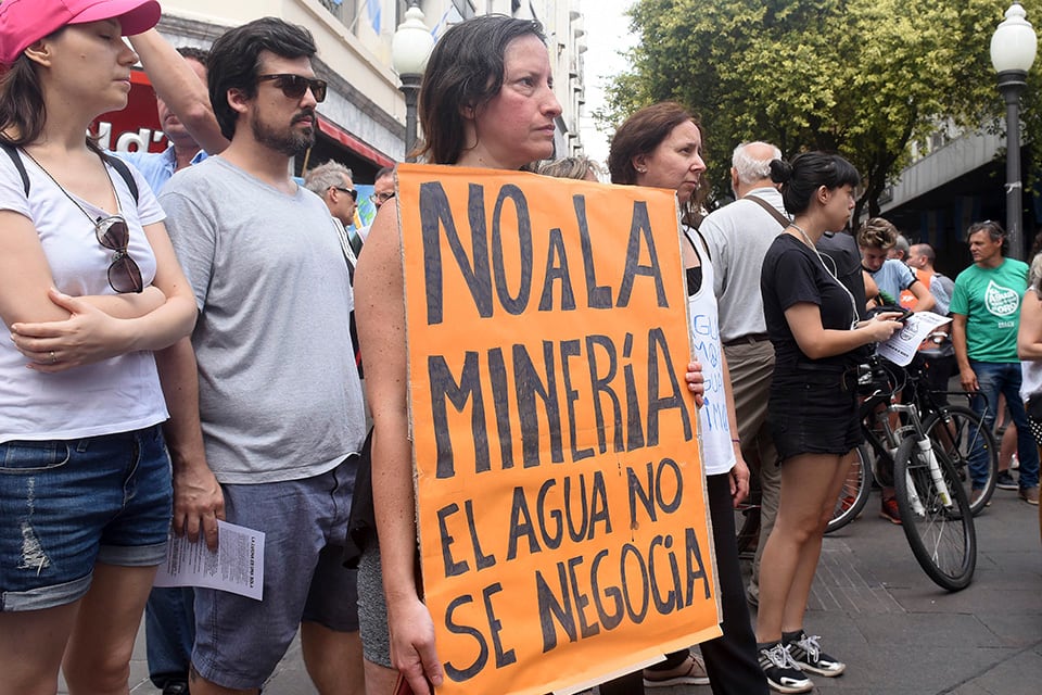 Un bidón con la inscripción "cianuro" arriba de la mesa, debajo de un gazebo, en el cruce de las peatonales, era uno de los puntos de reunión ayer al mediodía, cuando el sol apretaba y la calle par