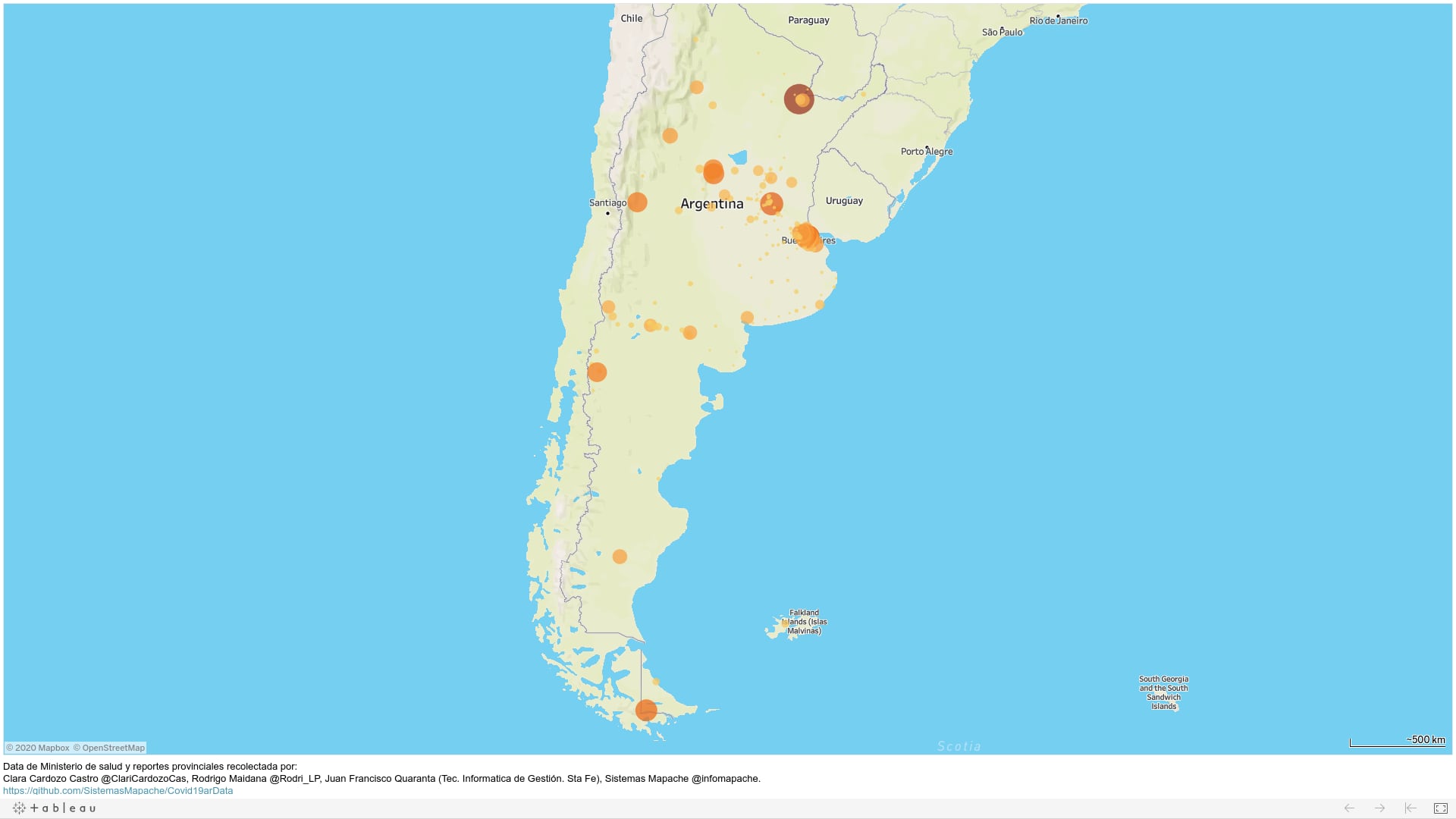 Este mapa muestra datos de infectados por coronavirus en todo el territorio nacional. Cobra relevancia en esta etapa de cuarentena administrada. Es parte de un trabajo interdisciplinario coordinado por la empresa Sistemas mapache que Página/12 pone a disposición de sus lectores y lectoras.