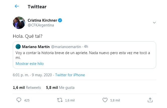 La vicepresidenta Cristina Kirchner hizo eco de la denuncia pública que hizo el periodista Mariano Martín sobre “un apriete” proveniente de una persona vinculada al fiscal general por