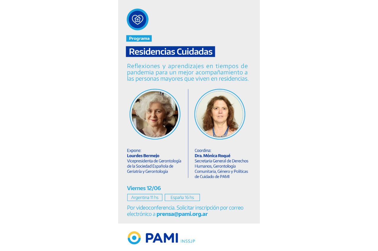 En el marco del programa Residencias Cuidadas, el PAMI invita este viernes a una videoconferencia titulada "Reflexiones y aprendizajes en tiempos de pandemia para un mejor acompañamiento a las pers