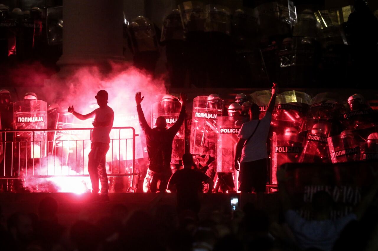La policía detuvo a 71 personas, entre ellas a un británico y a un tunecino, en las manifestaciones registradas el viernes por la noche en Belgrado, la capital serbia, que generaron en disturbios,