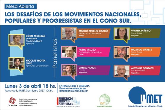 Con entrada libre y gratuita, desde las 18 se presenta en el auditorio de la Universidad Metropolitana para la Educación y el Trabajo (UMET) el panel “Los desafíos de los movimientos nacionales, populares y progresistas en el Cono Sur”, con referentes de distintos partidos de la región. Siga el debate en vivo.